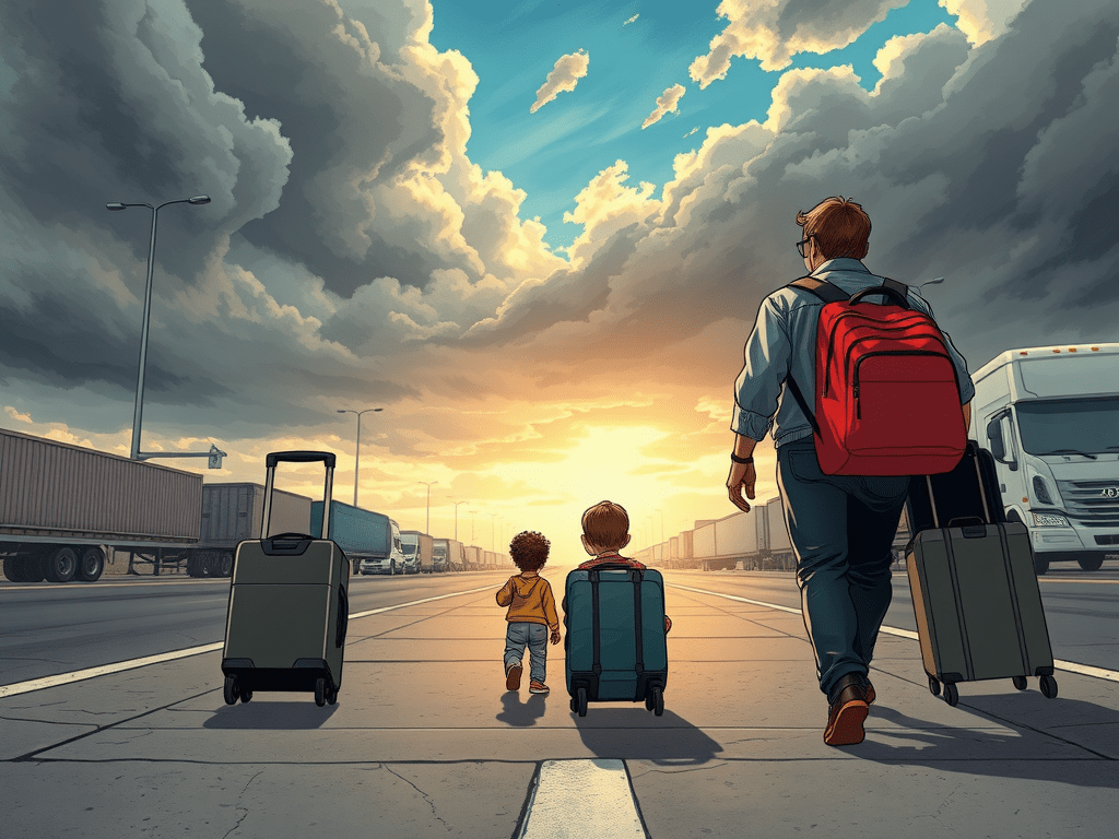 Un’immagine immortala un momento dinamico, di vita reale, quotidiana; una famiglia di quattro persone – tre persone più una, la quarta si intuisce, impallata dal padre in primo piano (come i Moschettieri di Dumas, padre?) – con zaini in spalla e bagagli a rotelle (difficile siano quelli il loro mezzo di trasporto) camminano velocemente, forse per giungere in tempo al capolinea di un qualche veicolo pubblico. Sono visibilmente di fretta, con la scomoda compagnia dell’ansia di mancare l’imbarco. La strada di cemento sembra lunga, grigia quanto basta, lambisce una strada commerciale sulla quale transitano mostruosi autotreni statunitensi; in lontananza edifici di un centro, abitato, non si sa se da macchine o persone. Un cielo imbronciato e minaccioso, con uno squarcio di azzurro, assiste implacabile alla scena.