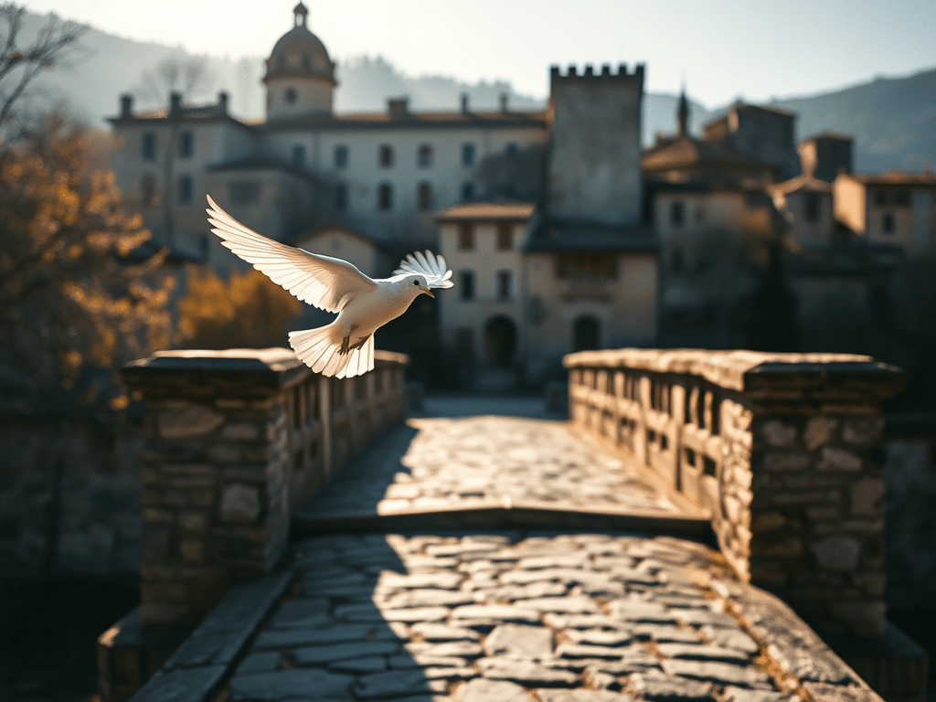 Un aggraziato colombo – non un piccione lagunare, quale sarà la differenza? – plana sul bordo del ponte in muratura che conduce al Castello, osserva con calma la situazione e poi, incurante, riprende il suo volo mattutino.