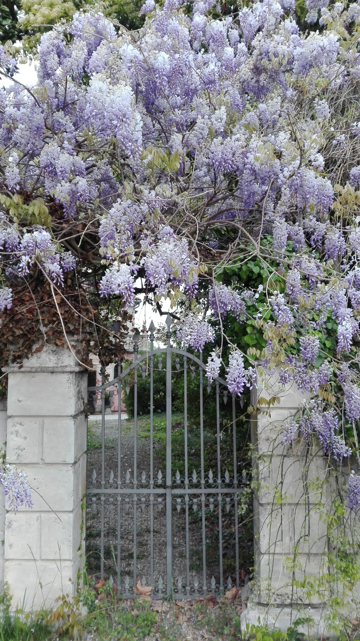Un piccolo cancello, ferroso arrugginito, incardinato in una soffice delicata purpurea cascata di Glicini che sembra scendano direttamente dalle nuvole, varco dimensionale per un altro mondo, onirico magico alieno.